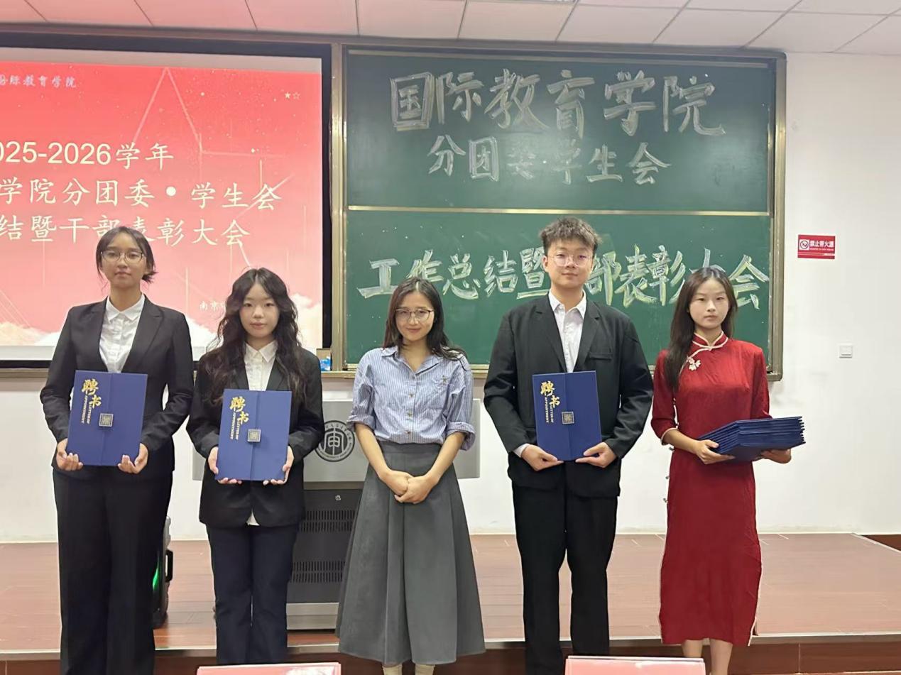 在李欣汝同学的精彩分享后,迎来了激动人心的颁奖环节。首先由姚硕老师为上一届国际教育学院分团委·学生会部长代表颁发聘书,随后由金晨老师为上一届主席和副书记颁发聘书,最后马浩杰老师为上一届优秀部长和先进菁英颁发奖状。这不仅是对他们工作勤奋刻苦的认可,更是为新一届干部树立了学习的榜样。