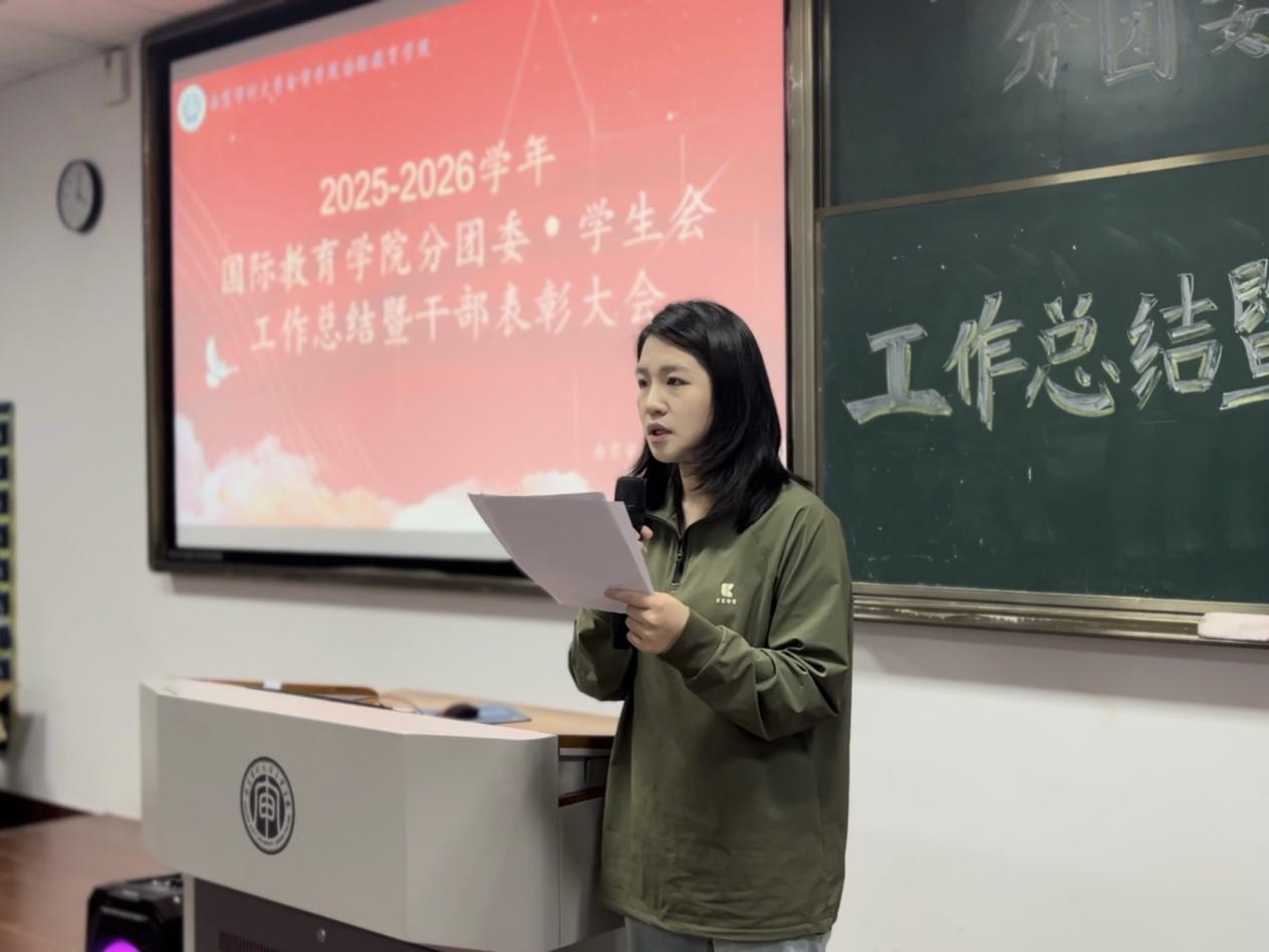 为锚定新学期工作航向,深化团学组织建设,激发同学们的工作热情,国际教育学院10月15日在C中501,特对团学全体成员召开工作总结暨干部表彰大会。南京审计大学金审学院国际教育学院副院长、党总支副书记张驰,分团委书记马浩杰,学生党支部书记金晨,教研室副主任姚硕参加此次会议。