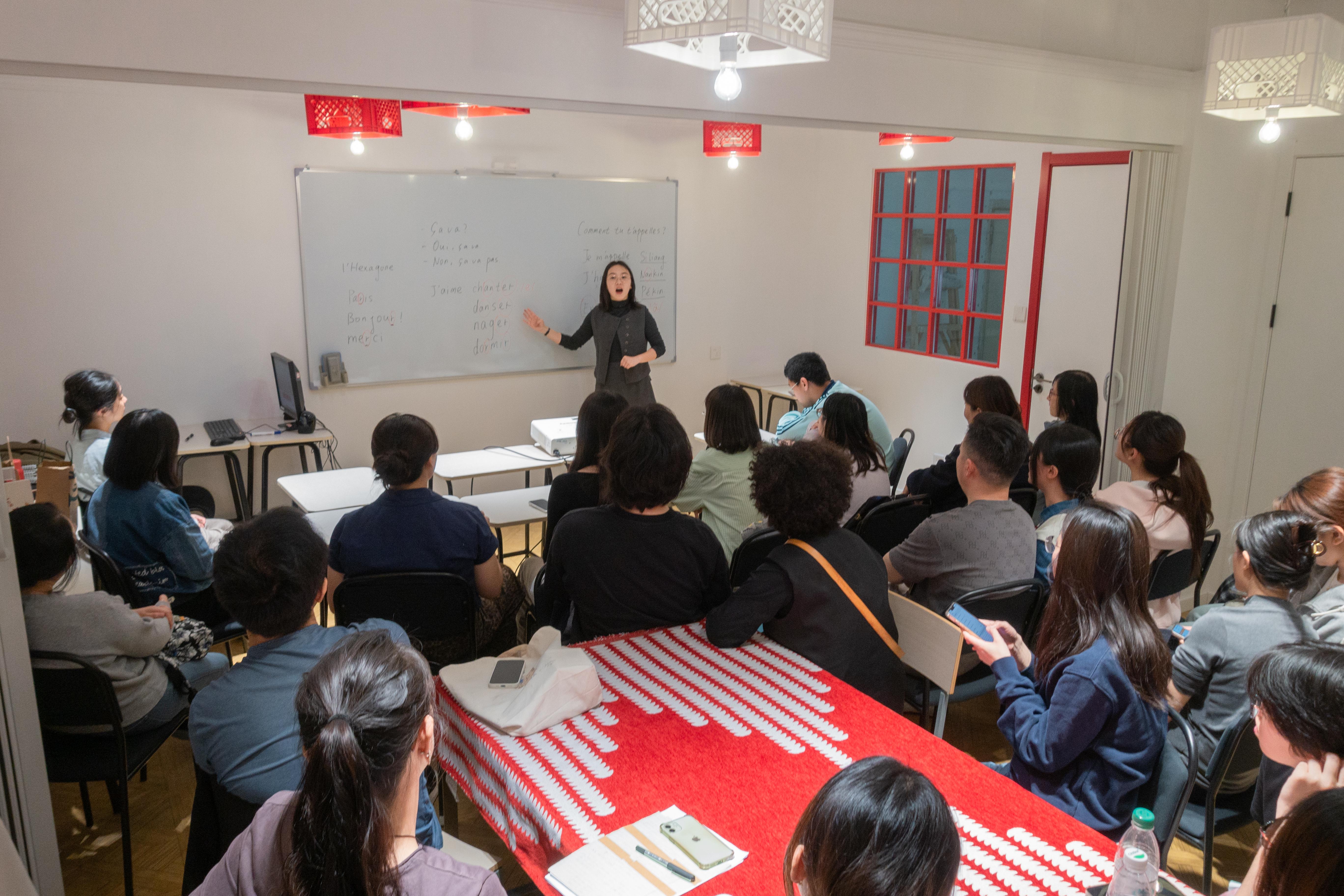 分享结束后,两方学生一同和校方负责人自由交流探讨。随后全员共同参与四十分钟法语体验课,课程以日常打招呼为开端,科普基础日常问候、礼貌口语表达,轻松的课堂氛围让大家直观感受法语韵味。